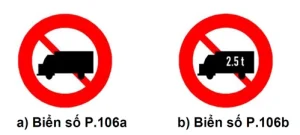 Biển P.106b là cấm ôtô tải có khối lượng chuyên chở lớn hơn 2,5 tấn. Tức không phụ thuộc vào khối lượng của xe là bao nhiêu, nếu khối lượng chuyên chở lớn hơn 2,5 tấn thì không được đi vào đường có biển này.