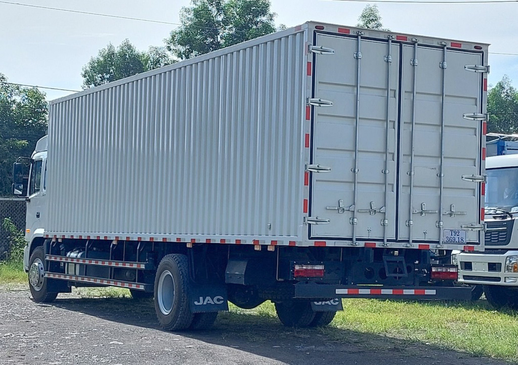 Xe tải Jac thùng kín Container có mẫu mã như chiếc Container, nhưng quy cách thiết kế và kích thước có những chí tiết khác.Thùng Container của xe tải Jac mởi cửa hông 2 cánh rộng 2,4m, 2 cánh cửa sau mỗi cánh rộng 1,2m. Xe tải Jac thùng Container đáp ứng hiệu quả chuyên chở các loại hàng hóa có tính chất bảo quản đòi hỏi cao trong quá trình vận chuyển.